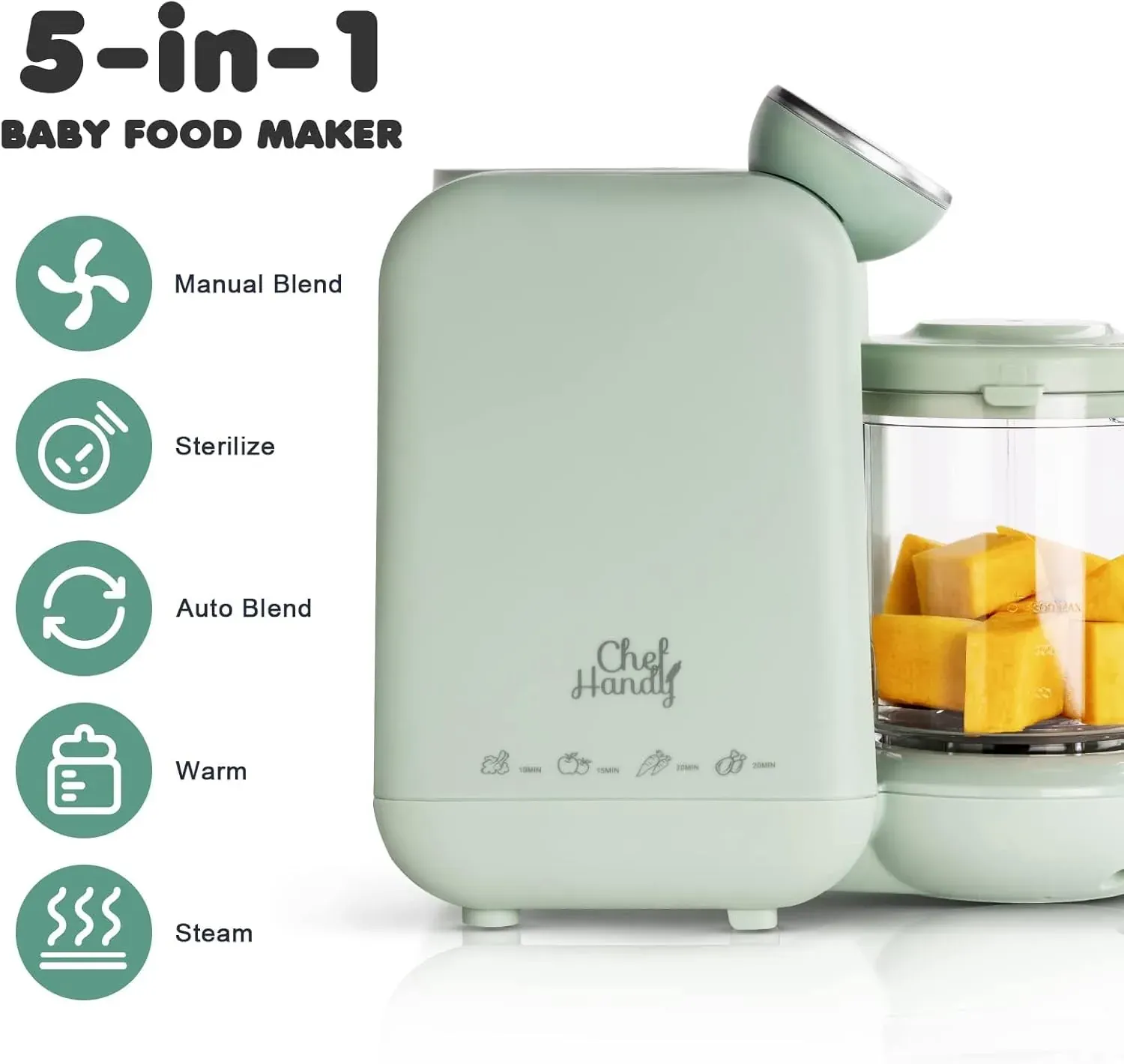 5-Stage Smart Baby Food Maker with Cooking & Blending – Gently steams ingredients to help retain natural flavor and nutrients, then blends with one-touch precision for perfectly smooth homemade purees. This all-in-one baby food steamer and blender makes preparing carrot, apple, pea, and other purees quick and effortless, supporting your baby’s daily mealtime needs.