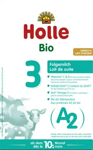 Holle Organic Infant Formula Based on Cow's Milk A2 contains a special blend of casein and whey protein. The milk comes from selected cows that produce the A2 beta casein protein only. From European farms and all ingredients are strictly controlled.