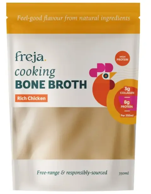 Freja Cooking Bone Broth is crafted from natural ingredients to bring nourishing, feel-good flavour to your everyday meals. Slowly simmered with free-range chicken bones, vegetables, and herbs, it’s naturally high in protein and a source of collagen, adding rich depth and wholesome goodness to any dish.
