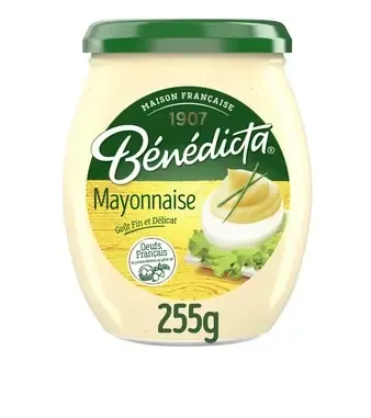 Enjoy the smooth, rich taste of Benedicta Mayonnaise, crafted with quality French ingredients for a perfectly balanced flavor and creamy texture.