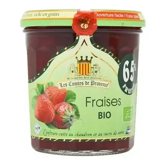 Enjoy the natural sweetness of fruit with Comtes de Provence Organic Strawberry Jam – Reduced Sugar, a traditional French preserve crafted with high fruit content and 30% less sugar than standard jams.