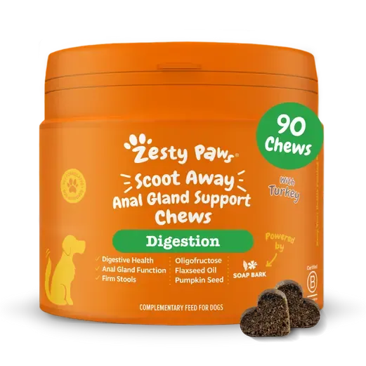 Zesty Paws Scoot Away Chews are vet-formulated with premium, science-backed ingredients to support digestive health, natural anal gland function, and comfortable bowel movements. Ideal for dogs that scoot, strain, or experience inconsistent stools, each chew features clinically studied quillaja saponaria (soap bark extract) to support gut health and help reduce stool odour, along with flaxseed oil to promote bowel health and support natural gland emptying. A natural fibre blend from toasted pumpkin seeds and chicory root helps encourage healthy stool formation and digestive comfort, while the tasty turkey flavour makes these soft chews easy to give daily—no tricks required.